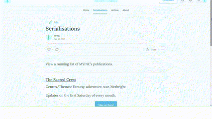 Myinc Stories is a newsletter consisting of ongoing novels. Each month, a new chapter of every story will be published under its own section of Myinc Stories. Take a look at the “Serialisations” page for specific details of each novel’s release schedule!