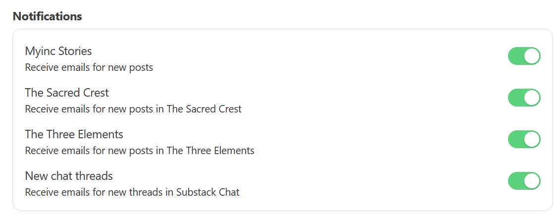 I’ve updated the settings so that you are now subscribed to The Sacred Crest and The Three Elements automatically. That saves a lot of fuss from having to do it directly!